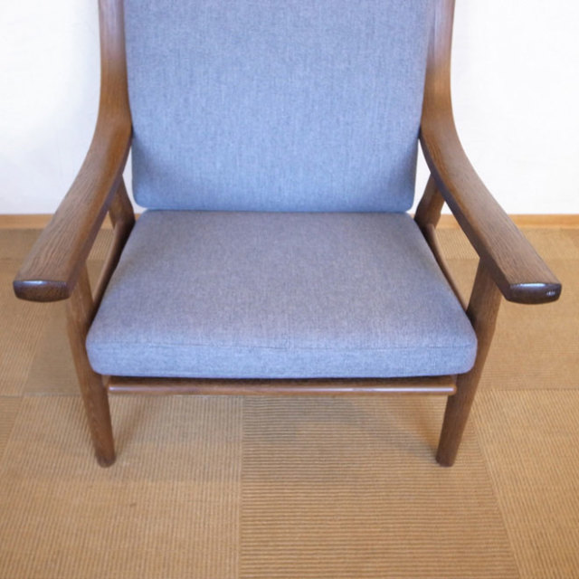 Hans・J・Wegner/ハンス・J・ウェグナーがデザインしたGE530のイージーチェアが入荷しました。ウェグナーの作品の中ではあまり見かけないモデルで、1973年に作られた、わりと後期の作品です。アームの形に特徴があり、オーク材で作られたフレームはステイン仕上げです。実際に座ると見た目以上にゆったりとしていて、たいへん座り心地がいいです。ファブリックは新しいものに交換してありますので、これから長くお使いいただけると思います。