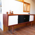 デンマークから、良質なチークがふんだんに使用されたサイドボードを入荷しました。1950年代に作られたヴィンテージ品で、色づいたチークの木肌がきれいなものです。このサイドボードから出る「オーラ」には圧倒です。扉のツートンカラーとオールドチークの色合いがマッチして重厚感と高級感が漂う、状態がとても良い物です。これからも長くお使いいただけます。真鍮のツマミを持って、真ん中の扉をスライドさせると引出しが現れます。その引出しの中には、グリーンのフェルトが貼ってあり、それも全体のデザインとマッチしています。使う事でも色や雰囲気をお楽しみ頂けます。また、そのフェルトを生かして、アクセサリー等の大切な物を収納されるのにも適しています。全体的に濃い色なので、シックなイメージのお部屋にとても合うサイドボードです。