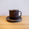 アラビア社を代表するデザイナーの一人、ウラ・プロコッペ。彼女がデザインした「Ruska-ルスカ-」シリーズのマグ&ソーサーが届きました。このシリーズは、秋の紅葉をイメージしたデザインと言われていて、一つ一つ色のグラデーションが違うのが特徴です。どんなシーンでも寛ぐ時間をより良い物にしてくれます。マグ、ソーサー共にしっかりしていて丈夫です。コンディションとしましては裏面のARABIAのマークが薄くなっていますが、これからも長く使って頂けると思います。手に入りにくい大きさで珍しいものです。