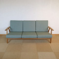 ウェグナーがデザインしたGE240を入荷しました。彼の代表作のGE290と並ぶ人気のソファですが、今は製造されていません。丸みを帯びたアームやレッグが特徴的で、その形状が葉巻に似ていることから別名「シガー」の愛称で呼ばれています。また、ファブリックは薄いグリーンをベースにしたオリジナルのもので、カジュアルなイメージとなっています。2ヵ所ほど小さな穴がありますが、そこからほつれていくようなものではなく、まだまだ使っていただけると思います。オークのフレームは大変コンディションは良く、GETAMAの刻印が見当たらない点からウェグナーの初期の作品のようです。リビングに置くのにちょうど良いサイズのこのソファは、お部屋に置くとアクセントをもたらしてくれます。