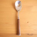 イェンス・クイストゴーがデザインしたダンスクのディナースプーンを入荷致しました。世界中で人気のダンスクのテーブルウェアです。木目が美しいチーク材が高級感を出しています。デザインも素敵ですが重厚感があり、手に持った時の重みが程良い感じです。わずかに擦れがありますが、使用感の少ない良いコンディションです。こちらのスプーンは日本製で1986年より3年間のみ作られた、なかなか市場に出てこないレアなシリーズです。オススメです。